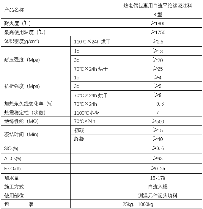為了適應現(xiàn)代化鋼廠對鋼水測溫定氧的準確性,我公司特研制了熱電偶包裹用高絕緣自流平中性水性填料。產(chǎn)品完全脫離了上世紀80年代研制的酸性鎂質(zhì)填料,該產(chǎn)品使用自來水攪拌后就可直接澆注偶頭,靜放12小時后就可以進入烤箱烘烤,比傳統(tǒng)酸性鎂質(zhì)填料縮短一倍烘烤時間就能達到理想的絕緣指數(shù),本產(chǎn)品以其優(yōu)良的自流動性、防潮性、操作簡單性、測溫準確性、高絕緣性、機械強度高、高溫下不變形、不爆裂等點贏得了廣大用戶的一致好評。