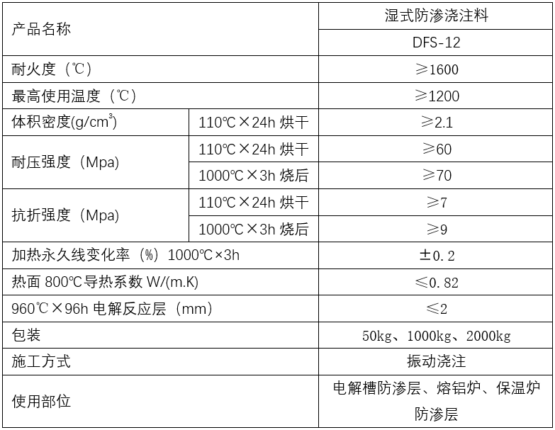 濕式防滲澆注料是鋁電解槽、鋁熔池、鋁保溫爐等不可 缺少的筑爐防滲材料,由本公司開發(fā)的DFS-12型防滲耐火澆注料是一種低水泥澆注料,它具有較高的強(qiáng)度,較低的顯氣孔率和較小的平均孔徑,施工時(shí)較少的用水量。在使用過(guò)程中,能與鋁液反應(yīng),形成玻璃體履蓋層,具有優(yōu)良的抗?jié)B性能。